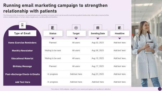The following slide showcases a comprehensive email marketing campaign which can be used to build strong patient relationship. Information covered in this slide is related to types of email, status, target users, sending date and headline. There are so many reasons you need a Guide To Healthcare Services Administration Running Email Marketing Campaign To Strengthen Relationship Rules PDF. The first reason is you cannot spend time making everything from scratch, Thus, Slidegeeks has made presentation templates for you too. You can easily download these templates from our website easily.