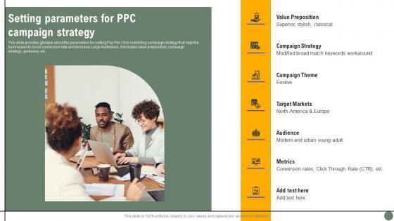 This slide provides glimpse about the parameters for setting Pay Per Click marketing campaign strategy that help the businesses to boost conversion rate and increase Large Audiences. It includes value preposition, campaign strategy, audience, etc. Slidegeeks has constructed Setting Parameters For PPC Exhaustive Guide Of Pay Per Click Advertising Initiatives Themes Pdf after conducting extensive research and examination. These presentation templates are constantly being generated and modified based on user preferences and critiques from editors. Here, you will find the most attractive templates for a range of purposes while taking into account ratings and remarks from users regarding the content. This is an excellent jumping off point to explore our content and will give new users an insight into our top notch PowerPoint Templates. This slide provides glimpse about the parameters for setting Pay Per Click marketing campaign strategy that help the businesses to boost conversion rate and increase Large Audiences. It includes value preposition, campaign strategy, audience, etc.