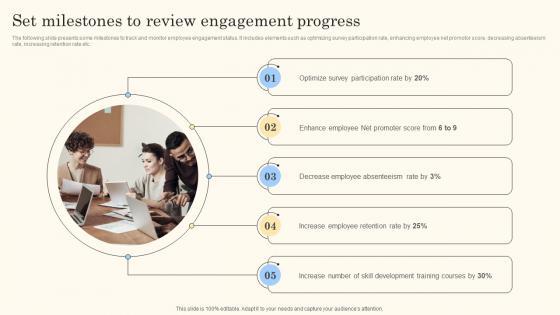 The following slide presents some milestones to track and monitor employee engagement status. It includes elements such as optimizing survey participation rate, enhancing employee net promotor score, decreasing absenteeism rate, increasing retention rate etc.If you are looking for a format to display your unique thoughts, then the professionally designed Set Milestones To Review Engagement Progress Action Steps For Employee Engagement Background Pdf is the one for you. You can use it as a Google Slides template or a PowerPoint template. Incorporate impressive visuals, symbols, images, and other charts. Modify or reorganize the text boxes as you desire. Experiment with shade schemes and font pairings. Alter, share or cooperate with other people on your work. Download Set Milestones To Review Engagement Progress Action Steps For Employee Engagement Background Pdf and find out how to give a successful presentation. Present a perfect display to your team and make your presentation unforgettable. The following slide presents some milestones to track and monitor employee engagement status. It includes elements such as optimizing survey participation rate, enhancing employee net promotor score, decreasing absenteeism rate, increasing retention rate etc.