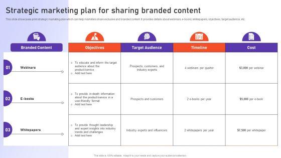 This slide showcases print strategic marketing plan which can help marketers share exclusive and branded content. It provides details about webinars, e-books, whitepapers, objectives, target audience, etc. Present like a pro with Strategic Marketing Plan For Sharing Branded Content Ppt PowerPoint Presentation File Show PDF Create beautiful presentations together with your team, using our easy to use presentation slides. Share your ideas in real time and make changes on the fly by downloading our templates. So whether you are in the office, on the go, or in a remote location, you can stay in sync with your team and present your ideas with confidence. With Slidegeeks presentation got a whole lot easier. Grab these presentations today.