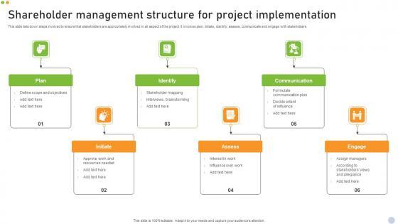 This slide lists down steps involved to ensure that stakeholders are appropriately involved in all aspect of the project. It involves plan, initiate, identify, assess, communicate and engage with stakeholders. Pitch your topic with ease and precision using this Shareholder Management Structure For Project Implementation Topics Pdf. This layout presents information on Communication, Shareholder Management Structure, Project Implementation. It is also available for immediate download and adjustment. So, changes can be made in the color, design, graphics or any other component to create a unique layout. This slide lists down steps involved to ensure that stakeholders are appropriately involved in all aspect of the project. It involves plan, initiate, identify, assess, communicate and engage with stakeholders.