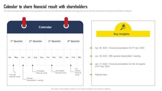This slide showcases calendar that can help organization to share key information with shareholders and engage them. Its key elements are financial result, general shareholders meeting etc. Create an editable Communication Means And Techniques Calendar To Share Financial Result With Shareholders Designs PDF that communicates your idea and engages your audience. Whether you are presenting a business or an educational presentation, pre-designed presentation templates help save time. Communication Means And Techniques Calendar To Share Financial Result With Shareholders Designs PDF is highly customizable and very easy to edit, covering many different styles from creative to business presentations. Slidegeeks has creative team members who have crafted amazing templates. So, go and get them without any delay.