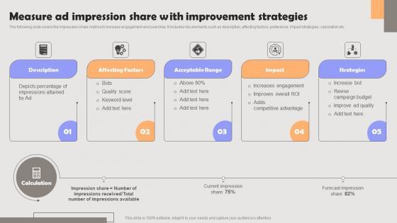 The following slide covers the impression share metrics to increase engagement and searches. It includes key elements such as description, affecting factors, preference, impact strategies, calculation etc. Explore a selection of the finest Improving PPC Campaign Results Measure Ad Impression Share With Improvement Template Pdf here. With a plethora of professionally designed and pre-made slide templates, you can quickly and easily find the right one for your upcoming presentation. You can use our Improving PPC Campaign Results Measure Ad Impression Share With Improvement Template Pdf to effectively convey your message to a wider audience. Slidegeeks has done a lot of research before preparing these presentation templates. The content can be personalized and the slides are highly editable. Grab templates today from Slidegeeks. The following slide covers the impression share metrics to increase engagement and searches. It includes key elements such as description, affecting factors, preference, impact strategies, calculation etc.