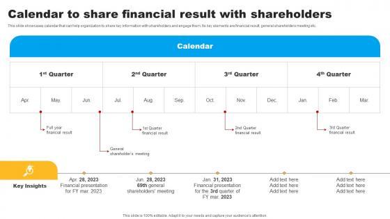 This slide showcases calendar that can help organization to share key information with shareholders and engage them. Its key elements are financial result, general shareholders meeting etc. Slidegeeks is one of the best resources for PowerPoint templates. You can download easily and regulate Strategies To Maintain Effective Relationships Calendar To Share Financial Result Professional Pdf for your personal presentations from our wonderful collection. A few clicks is all it takes to discover and get the most relevant and appropriate templates. Use our Templates to add a unique zing and appeal to your presentation and meetings. All the slides are easy to edit and you can use them even for advertisement purposes. This slide showcases calendar that can help organization to share key information with shareholders and engage them. Its key elements are financial result, general shareholders meeting etc.