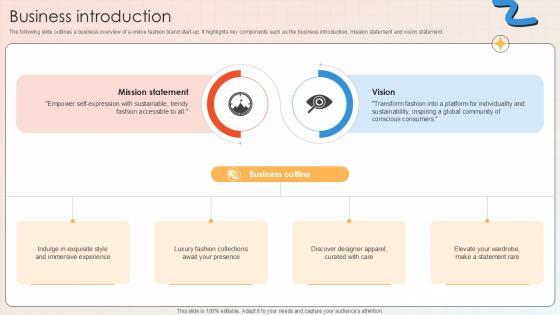 The following slide outlines a business overview of a online fashion brand start-up. It highlights key components such as the business introduction, mission statement and vision statement. Create an editable Business Introduction Apparel And Shoes E Commerce Market PPT Sample GTM SS V that communicates your idea and engages your audience. Whether you are presenting a business or an educational presentation, pre-designed presentation templates help save time. Business Introduction Apparel And Shoes E Commerce Market PPT Sample GTM SS V is highly customizable and very easy to edit, covering many different styles from creative to business presentations. Slidegeeks has creative team members who have crafted amazing templates. So, go and get them without any delay. The following slide outlines a business overview of a online fashion brand start-up. It highlights key components such as the business introduction, mission statement and vision statement.