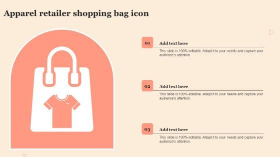 Showcasing this set of slides titled Apparel Retailer Shopping Bag Icon Icons Pdf The topics addressed in these templates are Apparel Retailer, Shopping Bag Icon All the content presented in this PPT design is completely editable. Download it and make adjustments in color, background, font etc. as per your unique business setting. Our Apparel Retailer Shopping Bag Icon Icons Pdf are topically designed to provide an attractive backdrop to any subject. Use them to look like a presentation pro.