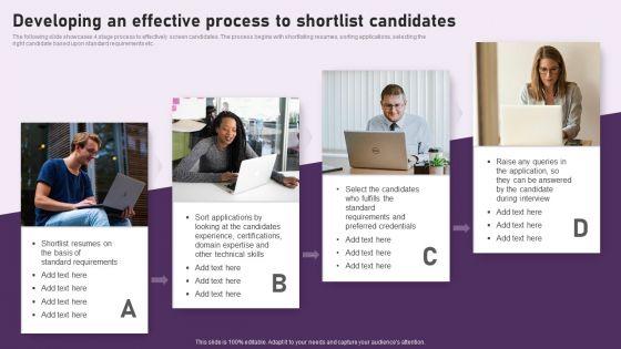 The following slide showcases 4 stage process to effectively screen candidates. The process begins with shortlisting resumes, sorting applications, selecting the right candidate based upon standard requirements etc. If you are looking for a format to display your unique thoughts, then the professionally designed Developing An Effective Process To Shortlist Candidates Inspiration PDF is the one for you. You can use it as a Google Slides template or a PowerPoint template. Incorporate impressive visuals, symbols, images, and other charts. Modify or reorganize the text boxes as you desire. Experiment with shade schemes and font pairings. Alter, share or cooperate with other people on your work. Download Developing An Effective Process To Shortlist Candidates Inspiration PDF and find out how to give a successful presentation. Present a perfect display to your team and make your presentation unforgettable.