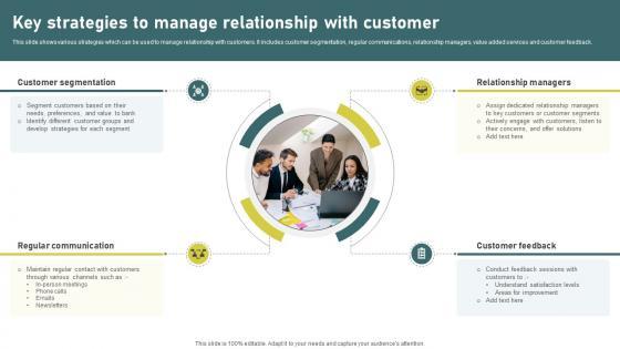 This slide shows various strategies which can be used to manage relationship with customers. It includes customer segmentation, regular communications, relationship managers, value added services and customer feedback. Presenting this PowerPoint presentation, titled Key Strategies To Manage Relationship Investment Banking Simplified Functions Fin SS V, with topics curated by our researchers after extensive research. This editable presentation is available for immediate download and provides attractive features when used. Download now and captivate your audience. Presenting this Key Strategies To Manage Relationship Investment Banking Simplified Functions Fin SS V. Our researchers have carefully researched and created these slides with all aspects taken into consideration. This is a completely customizable Key Strategies To Manage Relationship Investment Banking Simplified Functions Fin SS V that is available for immediate downloading. Download now and make an impact on your audience. Highlight the attractive features available with our PPTs. This slide shows various strategies which can be used to manage relationship with customers. It includes customer segmentation, regular communications, relationship managers, value added services and customer feedback.