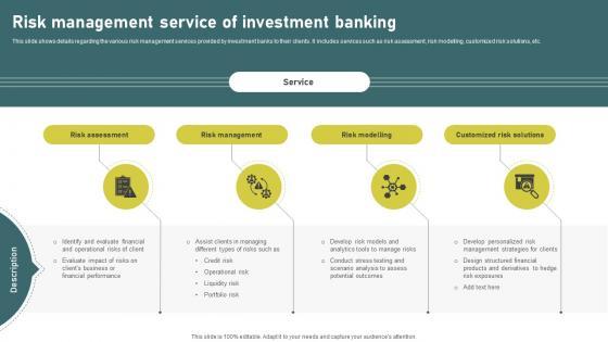 This slide shows details regarding the various risk management services provided by investment banks to their clients. It includes services such as risk assessment, risk modelling, customized risk solutions, etc. There are so many reasons you need a Risk Management Service Of Investment Banking Simplified Functions Fin SS V. The first reason is you can not spend time making everything from scratch, Thus, Slidegeeks has made presentation templates for you too. You can easily download these templates from our website easily. This slide shows details regarding the various risk management services provided by investment banks to their clients. It includes services such as risk assessment, risk modelling, customized risk solutions, etc.