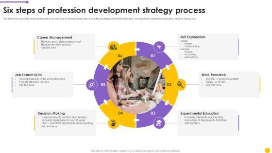 This slide shows process which can be used by an individual to develop career plan. It includes six steps such as self exploration, work research, experimental education, decision making, etc. Showcasing this set of slides titled Six Steps Of Profession Development Strategy Process Structure Pdf. The topics addressed in these templates are Career Management, Job Search Skills, Decision Making. All the content presented in this PPT design is completely editable. Download it and make adjustments in color, background, font etc. as per your unique business setting. This slide shows process which can be used by an individual to develop career plan. It includes six steps such as self exploration, work research, experimental education, decision making, etc.