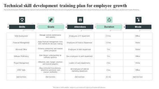 This slide showcases a training plan to improve employee technical skills efficiency for personal growth. It provides information about elements such as skills, goals, attendees, duration and mode of training. There are so many reasons you need a Technical Skill Development Training Plan For Employee Growth Template PDF. The first reason is you cannot spend time making everything from scratch, Thus, Slidegeeks has made presentation templates for you too. You can easily download these templates from our website easily.