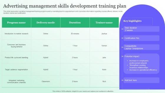 This slide represents marketing management training program used by marketing team to upgrade team skill. It provides information regarding courses offered, delivery mode, duration, trainer and certification. Showcasing this set of slides titled Advertising Management Skills Development Training Plan Brochure PDF. The topics addressed in these templates are Introduction To Market Research, Consumer Business Buying Behavior, Product Life Cycle Branding. All the content presented in this PPT design is completely editable. Download it and make adjustments in color, background, font etc. as per your unique business setting.