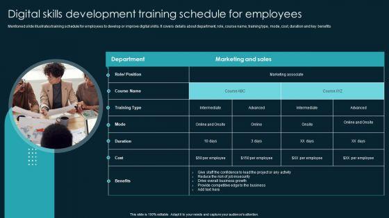 Mentioned slide illustrates training schedule for employees to develop or improve digital skills. It covers details about department, role, course name, training type, mode, cost, duration and key benefits. Make sure to capture your audiences attention in your business displays with our gratis customizable Implementing Digital Transformation Digital Skills Development Training Schedule Designs PDF. These are great for business strategies, office conferences, capital raising or task suggestions. If you desire to acquire more customers for your tech business and ensure they stay satisfied, create your own sales presentation with these plain slides.