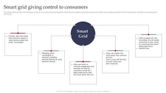 This slide outlines how the smart grid gives control to consumers about managing their electricity consumption, knowing the billing amount of the consumed power with the help of smart meters, and helps in saving electricity and money. Slidegeeks has constructed Smart Grid Giving Control To Consumers Smart Grid Working after conducting extensive research and examination. These presentation templates are constantly being generated and modified based on user preferences and critiques from editors. Here, you will find the most attractive templates for a range of purposes while taking into account ratings and remarks from users regarding the content. This is an excellent jumping off point to explore our content and will give new users an insight into our top notch PowerPoint Templates. This slide outlines how the smart grid gives control to consumers about managing their electricity consumption, knowing the billing amount of the consumed power with the help of smart meters, and helps in saving electricity and money.