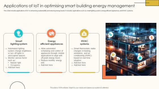This slide includes applications of IoT in enhancing sustainability and reducing energy waste. It includes applications such as smart lighting system, energy efficient appliances, and HVAC systems. Create an editable Applications Of IoT In Optimising Smart Internet Of Things Solutions To Enhance Energy IoT SS V that communicates your idea and engages your audience. Whether you are presenting a business or an educational presentation, pre-designed presentation templates help save time. Applications Of IoT In Optimising Smart Internet Of Things Solutions To Enhance Energy IoT SS V is highly customizable and very easy to edit, covering many different styles from creative to business presentations. Slidegeeks has creative team members who have crafted amazing templates. So, go and get them without any delay. This slide includes applications of IoT in enhancing sustainability and reducing energy waste. It includes applications such as smart lighting system, energy efficient appliances, and HVAC systems.