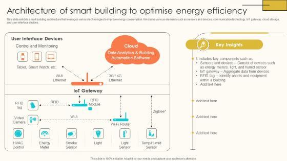 This slide exhibits smart building architecture that leverages various technologies to improve energy consumption. It includes various elements such as sensors and devices, communication technology, IoT gateway, cloud storage, and user interface devices. Slidegeeks is one of the best resources for PowerPoint templates. You can download easily and regulate Architecture Of Smart Building To Optimise Internet Of Things Solutions To Enhance Energy IoT SS V for your personal presentations from our wonderful collection. A few clicks is all it takes to discover and get the most relevant and appropriate templates. Use our Templates to add a unique zing and appeal to your presentation and meetings. All the slides are easy to edit and you can use them even for advertisement purposes. This slide exhibits smart building architecture that leverages various technologies to improve energy consumption. It includes various elements such as sensors and devices, communication technology, IoT gateway, cloud storage, and user interface devices.