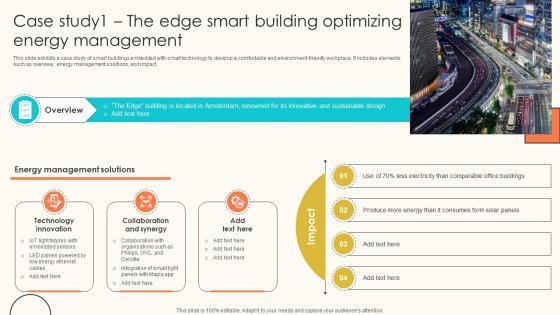 This slide exhibits a case study of smart buildings embedded with smart technology to develop a comfortable and environment-friendly workplace. It includes elements such as overview, energy management solutions, and impact. Want to ace your presentation in front of a live audience Our Case Study 1 The Edge Smart Building Internet Of Things Solutions To Enhance Energy IoT SS V can help you do that by engaging all the users towards you. Slidegeeks experts have put their efforts and expertise into creating these impeccable powerpoint presentations so that you can communicate your ideas clearly. Moreover, all the templates are customizable, and easy-to-edit and downloadable. Use these for both personal and commercial use. This slide exhibits a case study of smart buildings embedded with smart technology to develop a comfortable and environment-friendly workplace. It includes elements such as overview, energy management solutions, and impact.