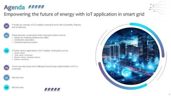 Slidegeeks is one of the best resources for PowerPoint templates. You can download easily and regulate Agenda Empowering The Future Of Energy With IoT Application In Smart Grid IoT SS V for your personal presentations from our wonderful collection. A few clicks is all it takes to discover and get the most relevant and appropriate templates. Use our Templates to add a unique zing and appeal to your presentation and meetings. All the slides are easy to edit and you can use them even for advertisement purposes. Our Agenda Empowering The Future Of Energy With IoT Application In Smart Grid IoT SS V are topically designed to provide an attractive backdrop to any subject. Use them to look like a presentation pro.