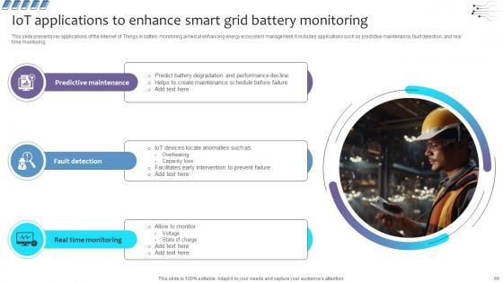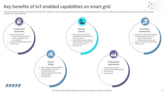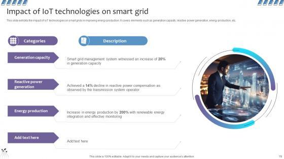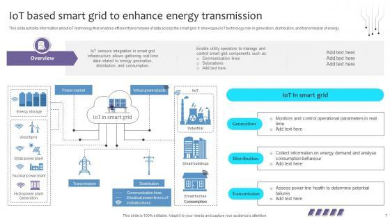 This slide exhibits information about IoT technology that enables efficient transmission of data across the smart grid. It showcases IoT technology role in generation, distribution, and transmission of energy. Create an editable A82 Empowering The Future IoT Based Smart Grid To Enhance Energy Transmission IoT SS V that communicates your idea and engages your audience. Whether you are presenting a business or an educational presentation, pre-designed presentation templates help save time. A82 Empowering The Future IoT Based Smart Grid To Enhance Energy Transmission IoT SS V is highly customizable and very easy to edit, covering many different styles from creative to business presentations. Slidegeeks has creative team members who have crafted amazing templates. So, go and get them without any delay. This slide exhibits information about IoT technology that enables efficient transmission of data across the smart grid. It showcases IoT technology role in generation, distribution, and transmission of energy.