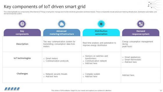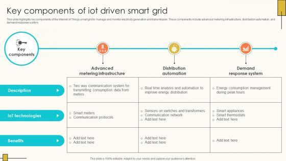 This slide highlights key components of the Internet of Things smart grid to manage and monitor electricity generation and transmission. These components include advanced metering infrastructure, distribution automation, and demand response system. Retrieve professionally designed Key Components Of IoT Driven Smart Grid Internet Of Things Solutions To Enhance Energy IoT SS V to effectively convey your message and captivate your listeners. Save time by selecting pre-made slideshows that are appropriate for various topics, from business to educational purposes. These themes come in many different styles, from creative to corporate, and all of them are easily adjustable and can be edited quickly. Access them as PowerPoint templates or as Google Slides themes. You do not have to go on a hunt for the perfect presentation because Slidegeeks got you covered from everywhere. This slide highlights key components of the Internet of Things smart grid to manage and monitor electricity generation and transmission. These components include advanced metering infrastructure, distribution automation, and demand response system.