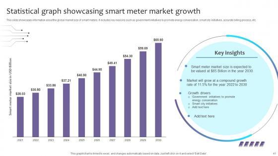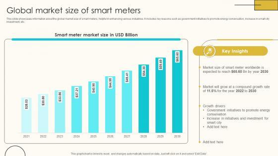 This slide showcases information about the global market size of smart meters, helpful in enhancing various industries. It includes key reasons such as government initiatives to promote energy conversation, increase in smart city investment, etc. From laying roadmaps to briefing everything in detail, our templates are perfect for you. You can set the stage with your presentation slides. All you have to do is download these easy-to-edit and customizable templates. Global Market Size Of Smart Meters Internet Of Things Solutions To Enhance Energy IoT SS V will help you deliver an outstanding performance that everyone would remember and praise you for. Do download this presentation today. This slide showcases information about the global market size of smart meters, helpful in enhancing various industries. It includes key reasons such as government initiatives to promote energy conversation, increase in smart city investment, etc.
