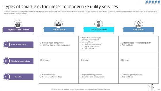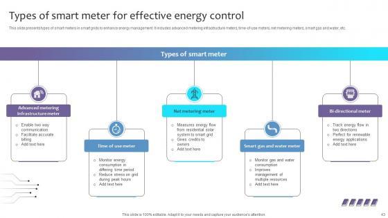 This slide presents types of smart meters in smart grids to enhance energy management. It includes advanced metering infrastructure meters, time-of-use meters, net metering meters, smart gas and water, etc. Here you can discover an assortment of the finest PowerPoint and Google Slides templates. With these templates, you can create presentations for a variety of purposes while simultaneously providing your audience with an eye-catching visual experience. Download Empowering The Future Types Of Smart Meter For Effective Energy Control IoT SS V to deliver an impeccable presentation. These templates will make your job of preparing presentations much quicker, yet still, maintain a high level of quality. Slidegeeks has experienced researchers who prepare these templates and write high-quality content for you. Later on, you can personalize the content by editing the Empowering The Future Types Of Smart Meter For Effective Energy Control IoT SS V. This slide presents types of smart meters in smart grids to enhance energy management. It includes advanced metering infrastructure meters, time-of-use meters, net metering meters, smart gas and water, etc.