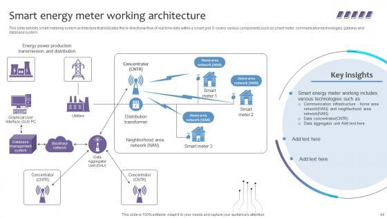 This slide exhibits smart metering system architecture that indicates the bi-directional flow of real time data within a smart grid. It covers various components such as smart meter, communication technologies, gateway and database system. Make sure to capture your audiences attention in your business displays with our gratis customizable Empowering The Future Smart Energy Meter Working Architecture IoT SS V. These are great for business strategies, office conferences, capital raising or task suggestions. If you desire to acquire more customers for your tech business and ensure they stay satisfied, create your own sales presentation with these plain slides. This slide exhibits smart metering system architecture that indicates the bi-directional flow of real time data within a smart grid. It covers various components such as smart meter, communication technologies, gateway and database system.