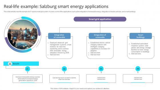 This slide exhibits real-life example of IoT-based smart grid system. It covers some of the applications such as the integration of renewable energy, integration of electric vehicles, and smart buildings. If your project calls for a presentation, then Slidegeeks is your go-to partner because we have professionally designed, easy-to-edit templates that are perfect for any presentation. After downloading, you can easily edit Empowering The Future Real Life Example Salzburg Smart Energy Applications IoT SS V and make the changes accordingly. You can rearrange slides or fill them with different images. Check out all the handy templates This slide exhibits real-life example of IoT-based smart grid system. It covers some of the applications such as the integration of renewable energy, integration of electric vehicles, and smart buildings.
