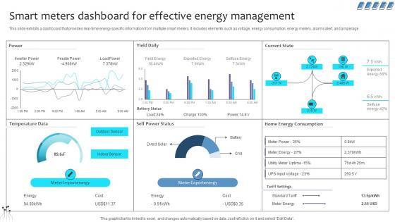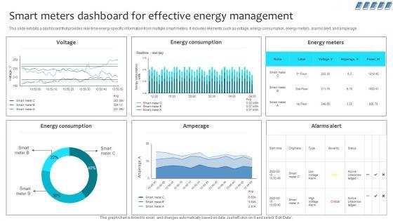 This slide exhibits a dashboard that provides real-time energy specific information from multiple smart meters. It includes elements such as voltage, energy consumption, energy meters, alarms alert, and amperage Welcome to our selection of the Empowering The Future Smart Meters Dashboard For Effective Energy IoT SS V. These are designed to help you showcase your creativity and bring your sphere to life. Planning and Innovation are essential for any business that is just starting out. This collection contains the designs that you need for your everyday presentations. All of our PowerPoints are 100Percent editable, so you can customize them to suit your needs. This multi-purpose template can be used in various situations. Grab these presentation templates today. This slide exhibits a dashboard that provides real-time energy specific information from multiple smart meters. It includes elements such as voltage, energy consumption, energy meters, alarms alert, and amperage