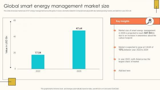 This slide showcase market size of IOT energy management across the globe. It covers elements related to Compound annual growth rate, fastest growing market, and data from year 2023-28. Present like a pro with Global Smart Energy Management Internet Of Things Solutions To Enhance Energy IoT SS V. Create beautiful presentations together with your team, using our easy-to-use presentation slides. Share your ideas in real-time and make changes on the fly by downloading our templates. So whether you are in the office, on the go, or in a remote location, you can stay in sync with your team and present your ideas with confidence. With Slidegeeks presentation got a whole lot easier. Grab these presentations today. This slide showcase market size of IOT energy management across the globe. It covers elements related to Compound annual growth rate, fastest growing market, and data from year 2023-28.