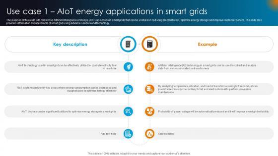 The purpose of this slide is to showcase Artificial Intelligence of Things AIoT use cases in smart grids that can be useful in in reducing electricity cost, optimize energy storage and improve customer service. The slide also provides information about example of smart grid using advance sensors and technology. Are you in need of a template that can accommodate all of your creative concepts This one is crafted professionally and can be altered to fit any style. Use it with Google Slides or PowerPoint. Include striking photographs, symbols, depictions, and other visuals. Fill, move around, or remove text boxes as desired. Test out color palettes and font mixtures. Edit and save your work, or work with colleagues. Download Integrating AI With IoT Use Case 1 AIoT Energy Applications In Smart Grids IoT SS V and observe how to make your presentation outstanding. Give an impeccable presentation to your group and make your presentation unforgettable. The purpose of this slide is to showcase Artificial Intelligence of Things AIoT use cases in smart grids that can be useful in in reducing electricity cost, optimize energy storage and improve customer service. The slide also provides information about example of smart grid using advance sensors and technology.