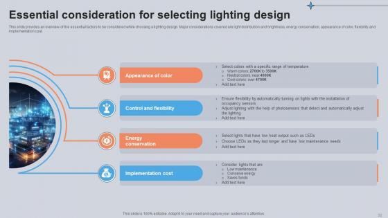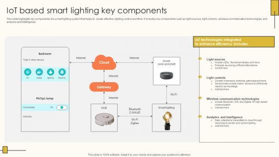 This slide highlights key components of a smart lighting system that helps to create effective lighting control workflow. It includes key components such as light sources, light controls, wireless communication technologies, and analysis and intelligence. Coming up with a presentation necessitates that the majority of the effort goes into the content and the message you intend to convey. The visuals of a PowerPoint presentation can only be effective if it supplements and supports the story that is being told. Keeping this in mind our experts created IoT Based Smart Lighting Key Components Internet Of Things Solutions To Enhance Energy IoT SS V to reduce the time that goes into designing the presentation. This way, you can concentrate on the message while our designers take care of providing you with the right template for the situation. This slide highlights key components of a smart lighting system that helps to create effective lighting control workflow. It includes key components such as light sources, light controls, wireless communication technologies, and analysis and intelligence.