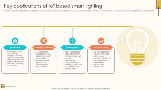 This slide presents the application of smart lighting in various industries to improve overall efficiency and user experience. It includes industries such as smart homes, commercial buildings, street lighting, and industrial facilities. The best PPT templates are a great way to save time, energy, and resources. Slidegeeks have 100 percent editable powerpoint slides making them incredibly versatile. With these quality presentation templates, you can create a captivating and memorable presentation by combining visually appealing slides and effectively communicating your message. Download Key Applications Of IoT Based Smart Lighting Internet Of Things Solutions To Enhance Energy IoT SS V from Slidegeeks and deliver a wonderful presentation. This slide presents the application of smart lighting in various industries to improve overall efficiency and user experience. It includes industries such as smart homes, commercial buildings, street lighting, and industrial facilities.