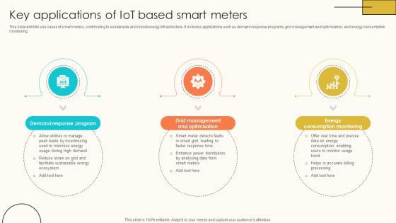 This slide exhibits use cases of smart meters, contributing to sustainable and robust energy infrastructure. It includes applications such as demand response programs, grid management and optimization, and energy consumption monitoring. The Key Applications Of IoT Based Smart Meters Internet Of Things Solutions To Enhance Energy IoT SS V is a compilation of the most recent design trends as a series of slides. It is suitable for any subject or industry presentation, containing attractive visuals and photo spots for businesses to clearly express their messages. This template contains a variety of slides for the user to input data, such as structures to contrast two elements, bullet points, and slides for written information. Slidegeeks is prepared to create an impression. This slide exhibits use cases of smart meters, contributing to sustainable and robust energy infrastructure. It includes applications such as demand response programs, grid management and optimization, and energy consumption monitoring.