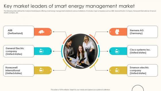 The following slide outlines the most prominent players offering smart energy management solutions to various institutions. It includes major companies such as ABB, General Electric Company, Honeywell International, Emerson electric company, etc. Presenting this PowerPoint presentation, titled Key Market Leaders Of Smart Energy Internet Of Things Solutions To Enhance Energy IoT SS V, with topics curated by our researchers after extensive research. This editable presentation is available for immediate download and provides attractive features when used. Download now and captivate your audience. Presenting this Key Market Leaders Of Smart Energy Internet Of Things Solutions To Enhance Energy IoT SS V. Our researchers have carefully researched and created these slides with all aspects taken into consideration. This is a completely customizable Key Market Leaders Of Smart Energy Internet Of Things Solutions To Enhance Energy IoT SS V that is available for immediate downloading. Download now and make an impact on your audience. Highlight the attractive features available with our PPTs. The following slide outlines the most prominent players offering smart energy management solutions to various institutions. It includes major companies such as ABB, General Electric Company, Honeywell International, Emerson electric company, etc.