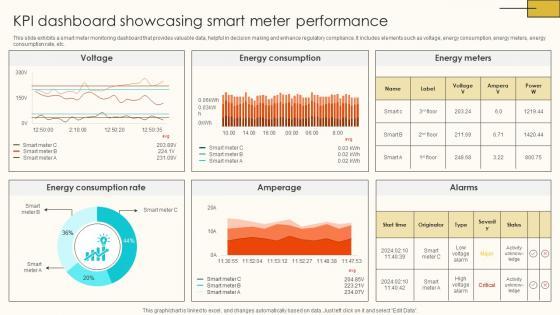 This slide exhibits a smart meter monitoring dashboard that provides valuable data, helpful in decision making and enhance regulatory compliance. It includes elements such as voltage, energy consumption, energy meters, energy consumption rate, etc. Here you can discover an assortment of the finest PowerPoint and Google Slides templates. With these templates, you can create presentations for a variety of purposes while simultaneously providing your audience with an eye-catching visual experience. Download KPI Dashboard Showcasing Smart Meter Internet Of Things Solutions To Enhance Energy IoT SS V to deliver an impeccable presentation. These templates will make your job of preparing presentations much quicker, yet still, maintain a high level of quality. Slidegeeks has experienced researchers who prepare these templates and write high-quality content for you. Later on, you can personalize the content by editing the KPI Dashboard Showcasing Smart Meter Internet Of Things Solutions To Enhance Energy IoT SS V. This slide exhibits a smart meter monitoring dashboard that provides valuable data, helpful in decision making and enhance regulatory compliance. It includes elements such as voltage, energy consumption, energy meters, energy consumption rate, etc.