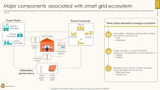 This slide includes elements that form foundation of smart grid ecosystem, contributing to more sustainable energy management. It includes three major elements such as power plants, power consumers, and alternative power sources. This Major Components Associated With Smart Internet Of Things Solutions To Enhance Energy IoT SS V from Slidegeeks makes it easy to present information on your topic with precision. It provides customization options, so you can make changes to the colors, design, graphics, or any other component to create a unique layout. It is also available for immediate download, so you can begin using it right away. Slidegeeks has done good research to ensure that you have everything you need to make your presentation stand out. Make a name out there for a brilliant performance. This slide includes elements that form foundation of smart grid ecosystem, contributing to more sustainable energy management. It includes three major elements such as power plants, power consumers, and alternative power sources.