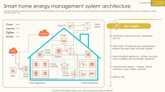 This slide showcases architecture that provides the foundation for effective home energy management in order to make informed decisions. It includes various elements such as smart meter, router, smart appliances, energy controller, solar PV, etc. The best PPT templates are a great way to save time, energy, and resources. Slidegeeks have 100 percent editable powerpoint slides making them incredibly versatile. With these quality presentation templates, you can create a captivating and memorable presentation by combining visually appealing slides and effectively communicating your message. Download Smart Home Energy Management System Internet Of Things Solutions To Enhance Energy IoT SS V from Slidegeeks and deliver a wonderful presentation. This slide showcases architecture that provides the foundation for effective home energy management in order to make informed decisions. It includes various elements such as smart meter, router, smart appliances, energy controller, solar PV, etc.