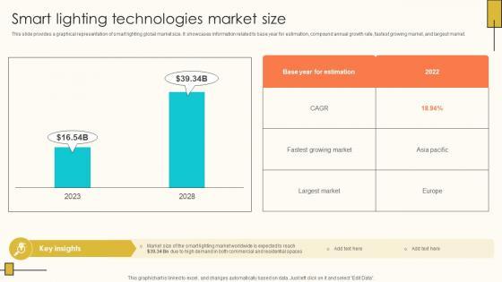 This slide provides a graphical representation of smart lighting global market size. It showcases information related to base year for estimation, compound annual growth rate, fastest growing market, and largest market. The Smart Lighting Technologies Market Size Internet Of Things Solutions To Enhance Energy IoT SS V is a compilation of the most recent design trends as a series of slides. It is suitable for any subject or industry presentation, containing attractive visuals and photo spots for businesses to clearly express their messages. This template contains a variety of slides for the user to input data, such as structures to contrast two elements, bullet points, and slides for written information. Slidegeeks is prepared to create an impression. This slide provides a graphical representation of smart lighting global market size. It showcases information related to base year for estimation, compound annual growth rate, fastest growing market, and largest market.