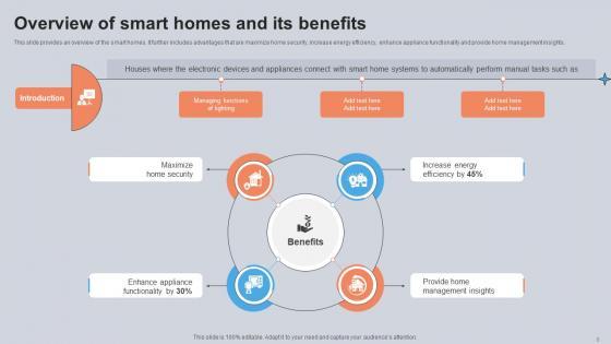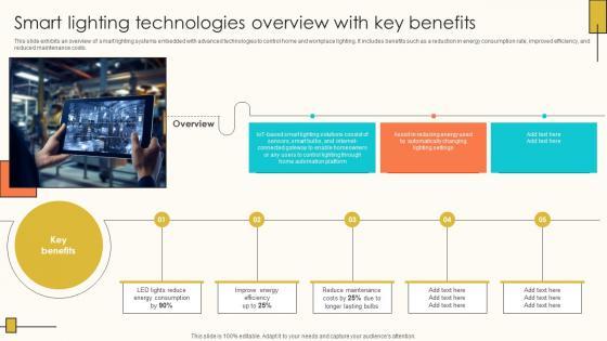 This slide exhibits an overview of smart lighting systems embedded with advanced technologies to control home and workplace lighting. It includes benefits such as a reduction in energy consumption rate, improved efficiency, and reduced maintenance costs. Are you searching for a Smart Lighting Technologies Overview With Internet Of Things Solutions To Enhance Energy IoT SS V that is uncluttered, straightforward, and original Its easy to edit, and you can change the colors to suit your personal or business branding. For a presentation that expresses how much effort you have put in, this template is ideal With all of its features, including tables, diagrams, statistics, and lists, its perfect for a business plan presentation. Make your ideas more appealing with these professional slides. Download Smart Lighting Technologies Overview With Internet Of Things Solutions To Enhance Energy IoT SS V from Slidegeeks today. This slide exhibits an overview of smart lighting systems embedded with advanced technologies to control home and workplace lighting. It includes benefits such as a reduction in energy consumption rate, improved efficiency, and reduced maintenance costs.