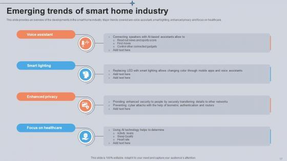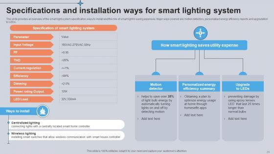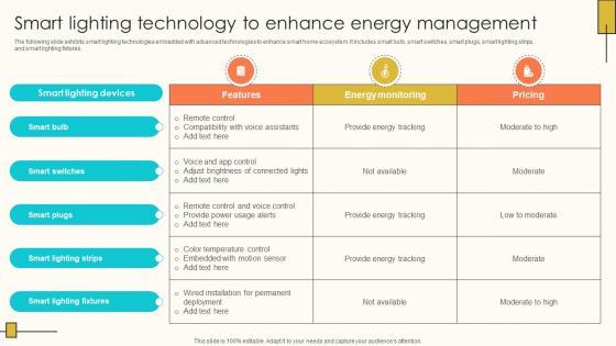The following slide exhibits smart lighting technologies embedded with advanced technologies to enhance smart home ecosystem. It includes smart bulb, smart switches, smart plugs, smart lighting strips, and smart lighting fixtures. Retrieve professionally designed Smart Lighting Technology To Enhance Energy Internet Of Things Solutions To Enhance Energy IoT SS V to effectively convey your message and captivate your listeners. Save time by selecting pre-made slideshows that are appropriate for various topics, from business to educational purposes. These themes come in many different styles, from creative to corporate, and all of them are easily adjustable and can be edited quickly. Access them as PowerPoint templates or as Google Slides themes. You do not have to go on a hunt for the perfect presentation because Slidegeeks got you covered from everywhere. The following slide exhibits smart lighting technologies embedded with advanced technologies to enhance smart home ecosystem. It includes smart bulb, smart switches, smart plugs, smart lighting strips, and smart lighting fixtures.