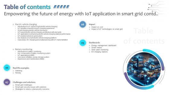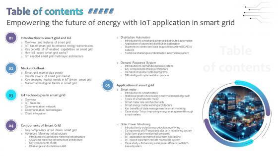 Find a pre-designed and impeccable Table Of Contents For Empowering The Future Of Energy With IoT Application In Smart Grid IoT SS V. The templates can ace your presentation without additional effort. You can download these easy-to-edit presentation templates to make your presentation stand out from others. So, what are you waiting for Download the template from Slidegeeks today and give a unique touch to your presentation. Our Table Of Contents For Empowering The Future Of Energy With IoT Application In Smart Grid IoT SS V are topically designed to provide an attractive backdrop to any subject. Use them to look like a presentation pro.