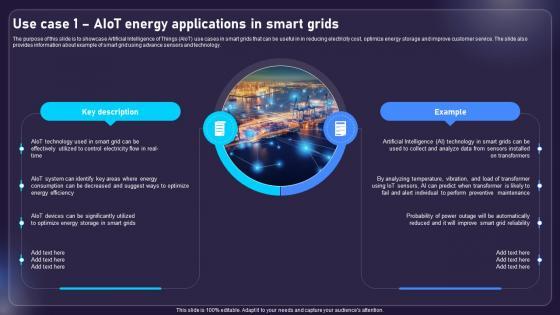 The purpose of this slide is to showcase Artificial Intelligence of Things AIoT use cases in smart grids that can be useful in in reducing electricity cost, optimize energy storage and improve customer service. The slide also provides information about example of smart grid using advance sensors and technology. Formulating a presentation can take up a lot of effort and time, so the content and message should always be the primary focus. The visuals of the PowerPoint can enhance the presenters message, so our Use Case 1 AIOT Energy Applications In Smart Grids AIOT Applications For Various Industries IoT SS V was created to help save time. Instead of worrying about the design, the presenter can concentrate on the message while our designers work on creating the ideal templates for whatever situation is needed. Slidegeeks has experts for everything from amazing designs to valuable content, we have put everything into Use Case 1 AIOT Energy Applications In Smart Grids AIOT Applications For Various Industries IoT SS V. The purpose of this slide is to showcase Artificial Intelligence of Things AIoT use cases in smart grids that can be useful in in reducing electricity cost, optimize energy storage and improve customer service. The slide also provides information about example of smart grid using advance sensors and technology.