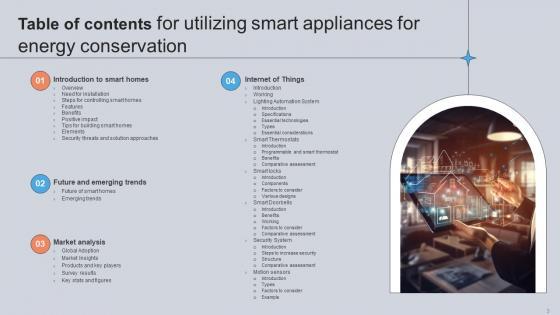 Do you have to make sure that everyone on your team knows about any specific topic I yes, then you should give Table Of Contents For Utilizing Smart Appliances For Energy Conservation IoT SS V a try. Our experts have put a lot of knowledge and effort into creating this impeccable Table Of Contents For Utilizing Smart Appliances For Energy Conservation IoT SS V. You can use this template for your upcoming presentations, as the slides are perfect to represent even the tiniest detail. You can download these templates from the Slidegeeks website and these are easy to edit. So grab these today Our Table Of Contents For Utilizing Smart Appliances For Energy Conservation IoT SS V are topically designed to provide an attractive backdrop to any subject. Use them to look like a presentation pro.