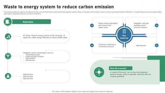 This slide provides an overview of waste-to-energy systems that employ advanced technologies for waste sorting, combustion and emission control in order to generate electricity efficiently. It includes features such as waste sorting automation, integration with grid, emission monitoring. Whether you have daily or monthly meetings, a brilliant presentation is necessary. Waste To Energy System To Reduce Carbon Emission IOT Applications In Smart Waste IoT SS V can be your best option for delivering a presentation. Represent everything in detail using Waste To Energy System To Reduce Carbon Emission IOT Applications In Smart Waste IoT SS V and make yourself stand out in meetings. The template is versatile and follows a structure that will cater to your requirements. All the templates prepared by Slidegeeks are easy to download and edit. Our research experts have taken care of the corporate themes as well. So, give it a try and see the results. This slide provides an overview of waste-to-energy systems that employ advanced technologies for waste sorting, combustion and emission control in order to generate electricity efficiently. It includes features such as waste sorting automation, integration with grid, emission monitoring.