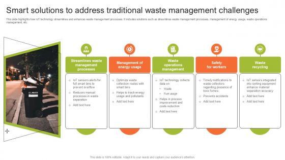This slide highlights how IoT technology streamlines and enhances waste management processes. It includes solutions such as streamlines waste management processes, management of energy usage, waste operations management, etc. Create an editable Smart Solutions To Address Traditional Step By Step Guide For Electronic Ppt Example that communicates your idea and engages your audience. Whether you are presenting a business or an educational presentation, pre-designed presentation templates help save time. Smart Solutions To Address Traditional Step By Step Guide For Electronic Ppt Example is highly customizable and very easy to edit, covering many different styles from creative to business presentations. Slidegeeks has creative team members who have crafted amazing templates. So, go and get them without any delay. This slide highlights how IoT technology streamlines and enhances waste management processes. It includes solutions such as streamlines waste management processes, management of energy usage, waste operations management, etc.