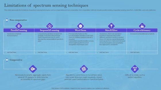 This slide represents the limitations of spectrum sensing techniques, such as cooperative and non-cooperative. Non-cooperative methods include parallel sensing, sequential sensing, wave form, match filter, and cyclo stationary. Make sure to capture your audiences attention in your business displays with our gratis customizable Smart Wireless Sensor Networks Limitations Of Spectrum Sensing Techniques Designs PDF. These are great for business strategies, office conferences, capital raising or task suggestions. If you desire to acquire more customers for your tech business and ensure they stay satisfied, create your own sales presentation with these plain slides.
