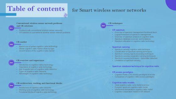 Boost your pitch with our creative Table Of Contents For Smart Wireless Sensor Networks Topics PDF. Deliver an awe-inspiring pitch that will mesmerize everyone. Using these presentation templates you will surely catch everyones attention. You can browse the ppts collection on our website. We have researchers who are experts at creating the right content for the templates. So you do not have to invest time in any additional work. Just grab the template now and use them.