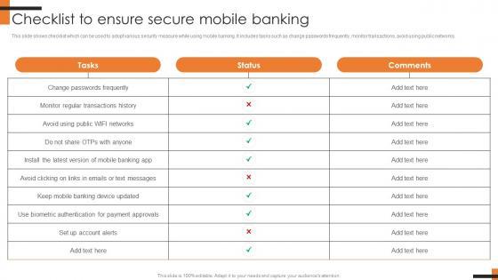 This slide shows checklist which can be used to adopt various security measure while using mobile banking. It includes tasks such as change passwords frequently, monitor transactions, avoid using public networks.Get a simple yet stunning designed Checklist To Ensure Secure Mobile Banking Comprehensive Smartphone Banking Professional Pdf. It is the best one to establish the tone in your meetings. It is an excellent way to make your presentations highly effective. So, download this PPT today from Slidegeeks and see the positive impacts. Our easy-to-edit Checklist To Ensure Secure Mobile Banking Comprehensive Smartphone Banking Professional Pdf can be your go-to option for all upcoming conferences and meetings. So, what are you waiting for Grab this template today. This slide shows checklist which can be used to adopt various security measure while using mobile banking. It includes tasks such as change passwords frequently, monitor transactions, avoid using public networks.