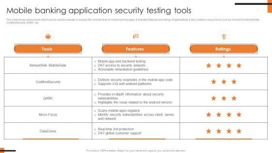 This slide shows various tools which can be used to evaluate or analyze the security level of mobile banking apps. It includes features and ratings of applications. It also contains various tools such as ImmuniWeb MobileSuite, CodifiedSecurity, QARK, etc.Create an editable Mobile Banking Application Security Testing Tools Comprehensive Smartphone Banking Icons Pdf that communicates your idea and engages your audience. Whether you are presenting a business or an educational presentation, pre-designed presentation templates help save time. Mobile Banking Application Security Testing Tools Comprehensive Smartphone Banking Icons Pdf is highly customizable and very easy to edit, covering many different styles from creative to business presentations. Slidegeeks has creative team members who have crafted amazing templates. So, go and get them without any delay. This slide shows various tools which can be used to evaluate or analyze the security level of mobile banking apps. It includes features and ratings of applications. It also contains various tools such as ImmuniWeb MobileSuite, CodifiedSecurity, QARK, etc.